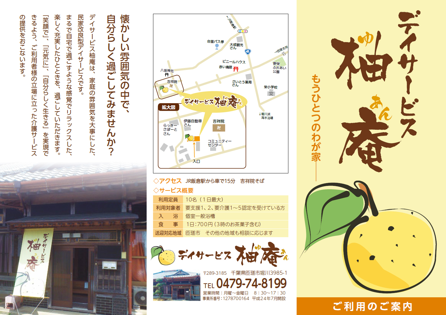 デイサービス柚庵は、家庭の雰囲気を大事にした民家改良型デイサービスです。